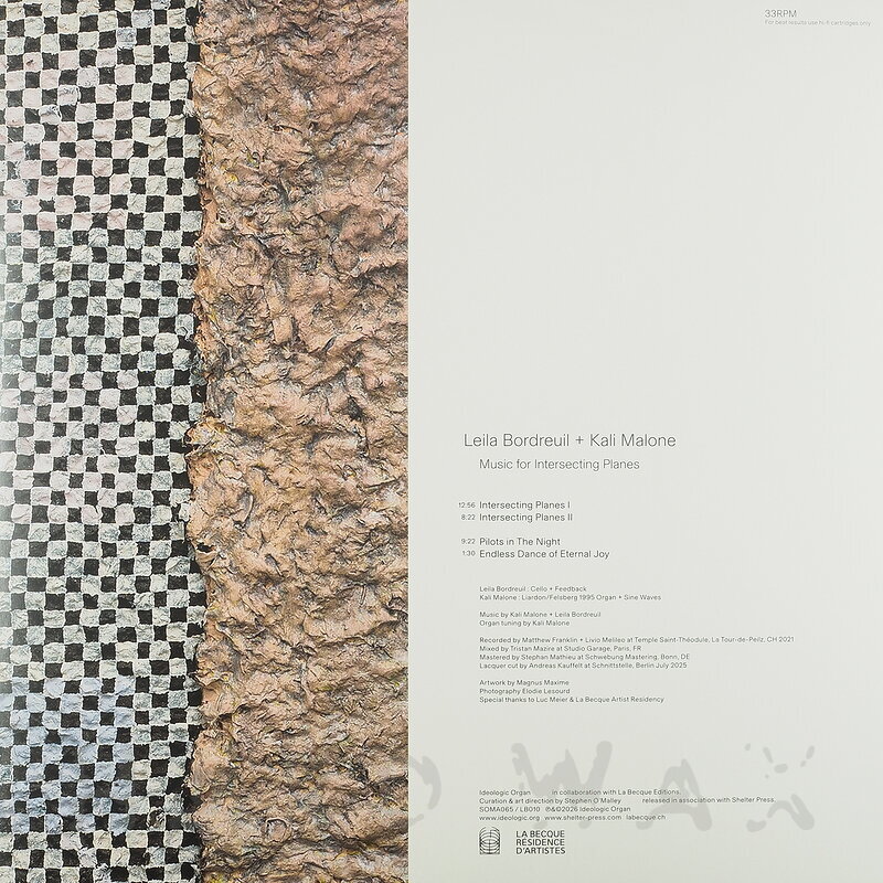 LP—LP € 32Ideologic Organ 065ElectronicKali Malone + Leila Bordreuil: Music for Intersecting PlanesMeditative, subtle, droning cello & organ studies A1 Intersecting Planes I A2 Intersecting Planes II B1 Pilots in The Night B2 Endless Dance of Eternal Joy