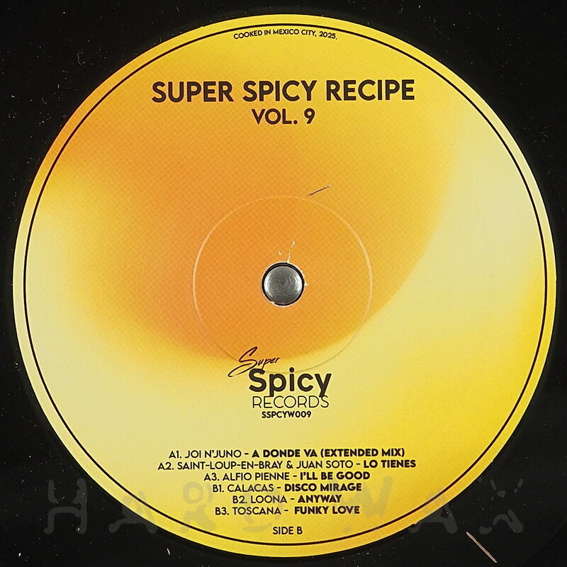 12"—12" € 17Super Spicy 009Label CatalogVarious Artists: Super Spicy Recipe Vol 9Feisty Disco House A1 Joi N'Juno: A Donde Va (Extended Mix) A2 Saint-Loup-En-Bray & Juan Soto: Lo Tienes A3 Alfio Pienne: I’ll Be Good B1 Calacas: Disco Mirage B2 Loona: Anyway B3 Toscana: Funky Love