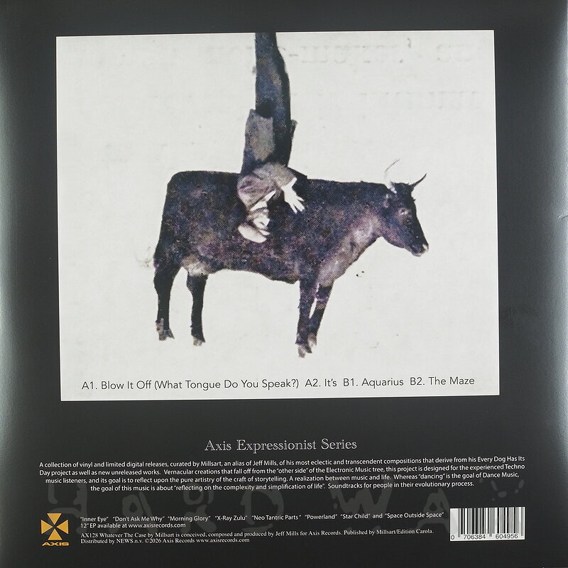 12"—12" € 17Axis 128Label CatalogMillsart: Whatever the CasePure, complex, eclectic & transcendent Experimental / Techno storytelling A1 Blow It Off (What Tongue You Speak?) A2 It's B1 Aquarius B2 The Maze