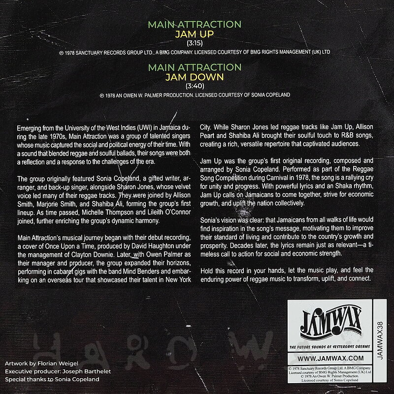 7"—7" € 18Jamwax 38Reggae / C7Main Attraction: Jam UpReissue of soulful, irresistible, late 70s roots gem A1 Jam Up B1 Jam Down