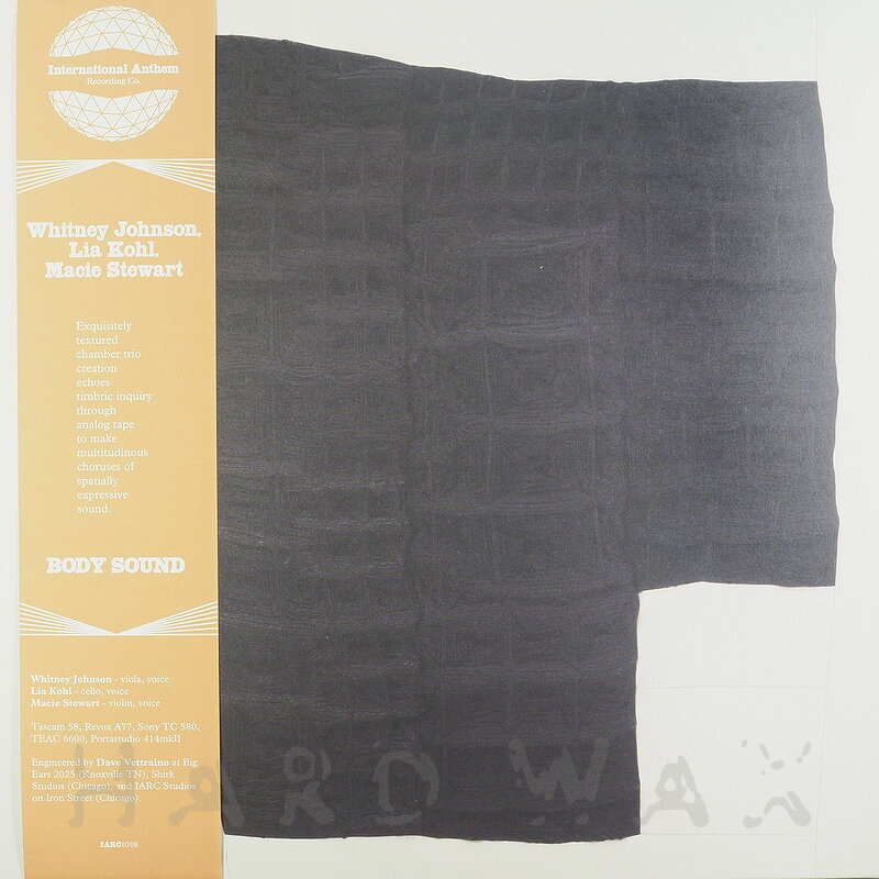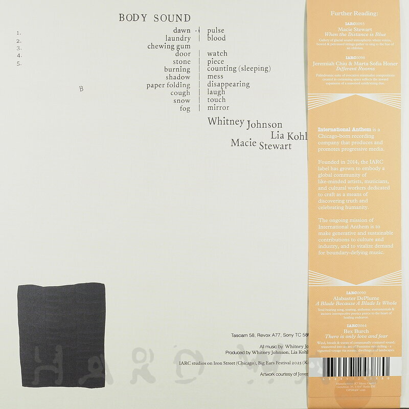 LP—LP € 29International Anthem 108Label CatalogWhitney Johnson, Lia Kohl & Macie Stewart: Body SoundWonderful, cinematic, strings & voices & tape effects centered Modern Classical / Ambient magic A1 dawn | pulse A2 laundry | blood A3 chewing gum A4 door | watch A5 stone | piece B1 burning | counting (sleeping) B2 shadow | mess B3 paper folding | disappearing B4 cough | laugh B5 snow | touch B6 fog | mirror