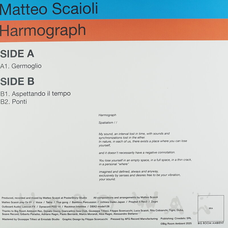 12"—12" € 24Big Room Ambient 001Label CatalogMatteo Scaioli: HarmographExcellent deep, fluid & organic, textured Ambient / Electronica mini LP A1 Germoglio B1 Aspettando il tempo B2 Ponti