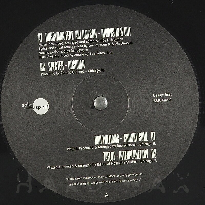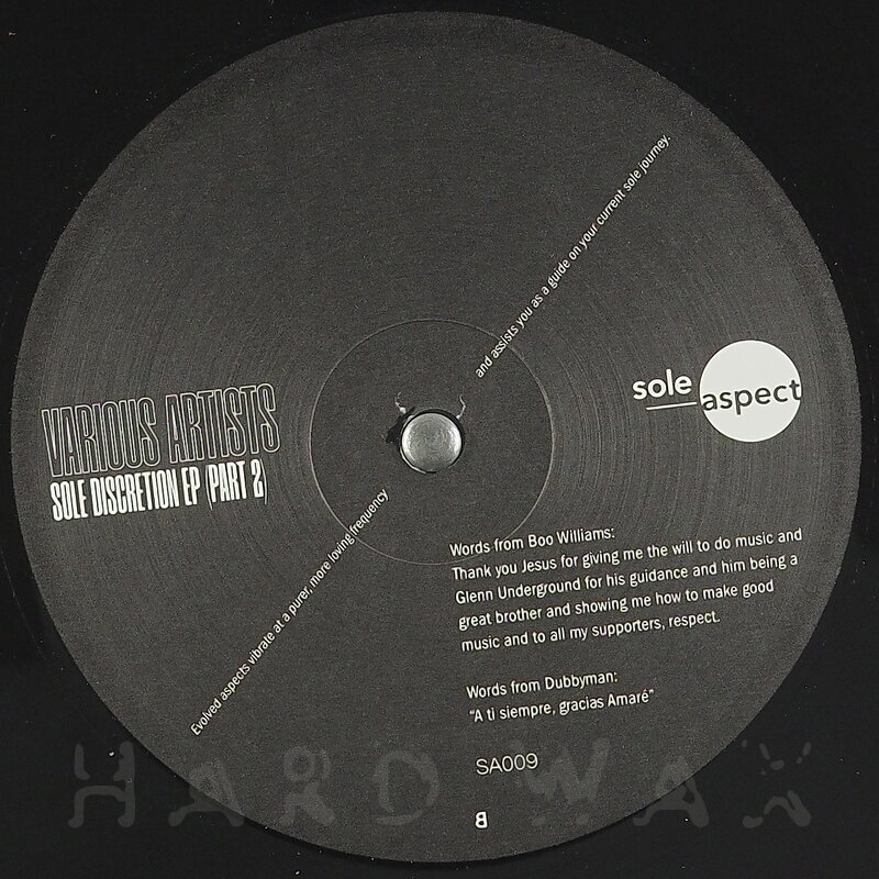 12"—12" € 21Sole Aspect 009Label CatalogVarious Artists: Sole Discretion EP Part 2Essential deep late-night Chicago house A1 Dubbyman: Always In & Out A2 Specter: Obsidian B1 Boo Williams: Chunky Soul B2 Taelue: Interplanetary
