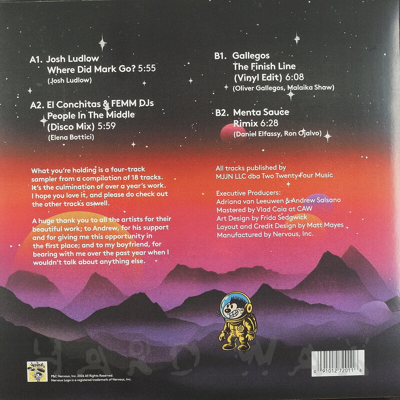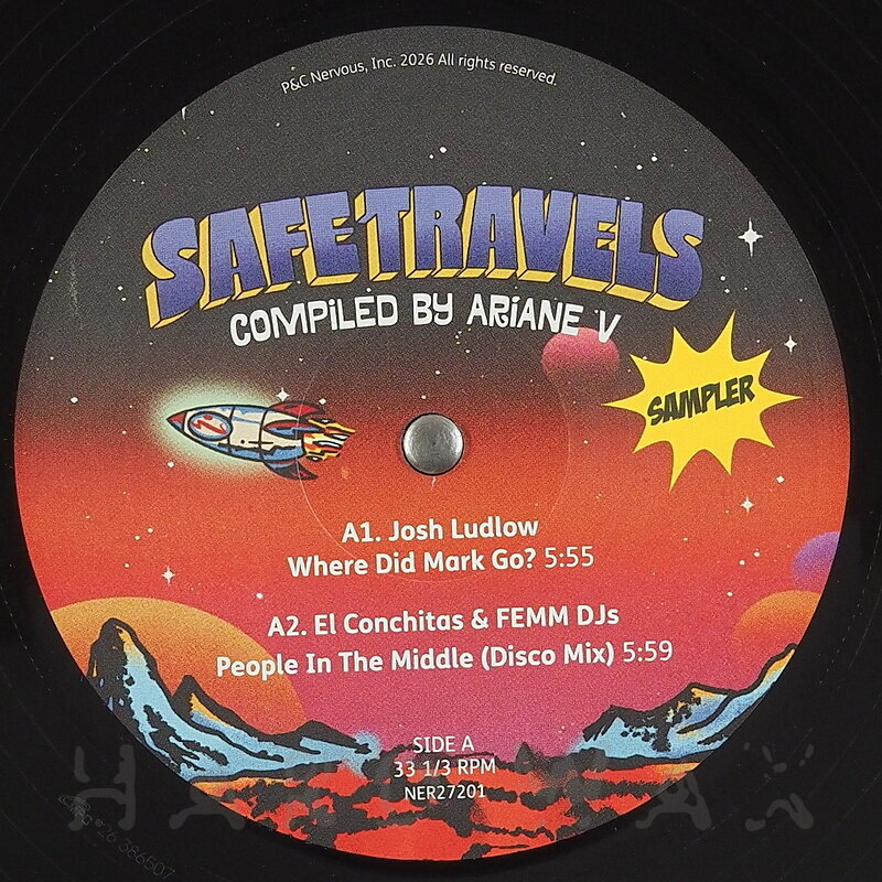12"—12" € 18Nervous 27201Label CatalogVarious Artists: Safe Travels SamplerCompiled by Ariane V. floor-friendly house tracks A1 Josh Ludlow: Where Did Mark Go A2 El Conchitas & Femm DJs: People In The Middle (Disco Mix) B1 Gallegos: The Finish Line (Vinyl Edit) B2 Menta Sauce: Rimix