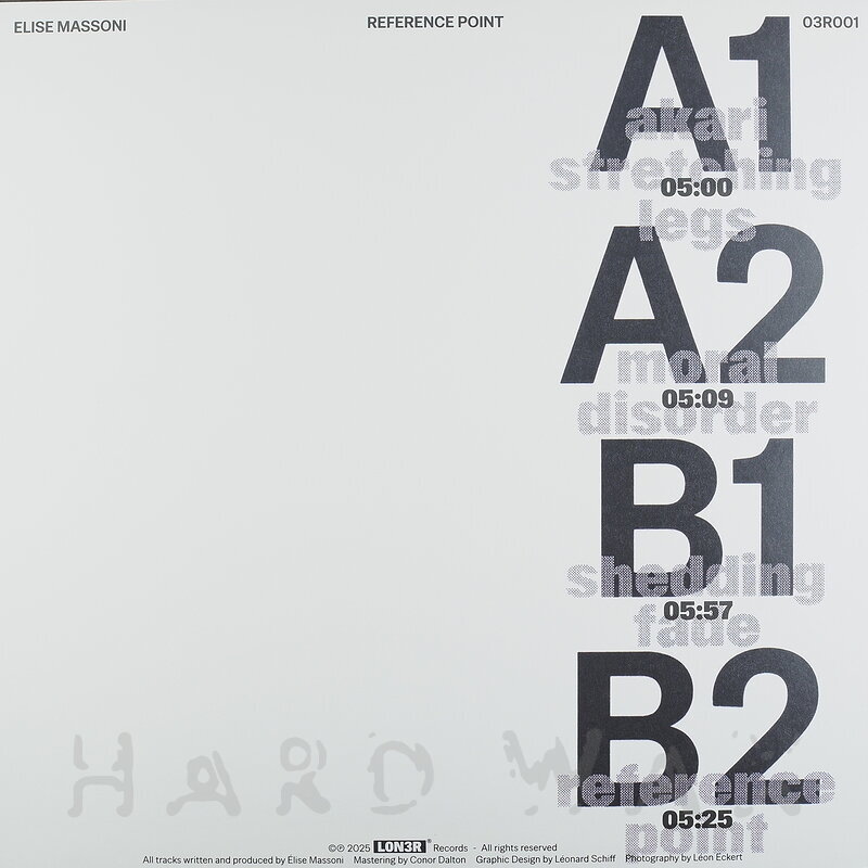 12"—12" € 16L0N3R 001Label CatalogElise Massoni: Reference PointReduced atmospheric DJ tool Techno trips A1 Akari Streching Legs A2 Moral Disorder B1 Shedding Fade B2 Reference Point
